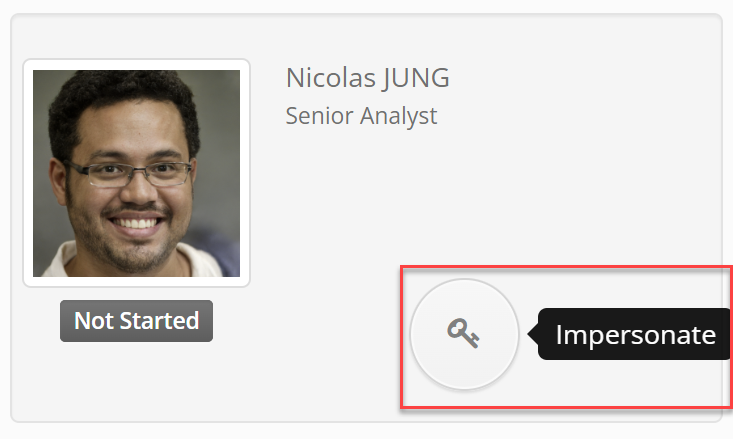 On the page where you see the statuses of supervisors and resource owners, you can click on an employee card. You should see an "Impersonate" button on their employee card.
