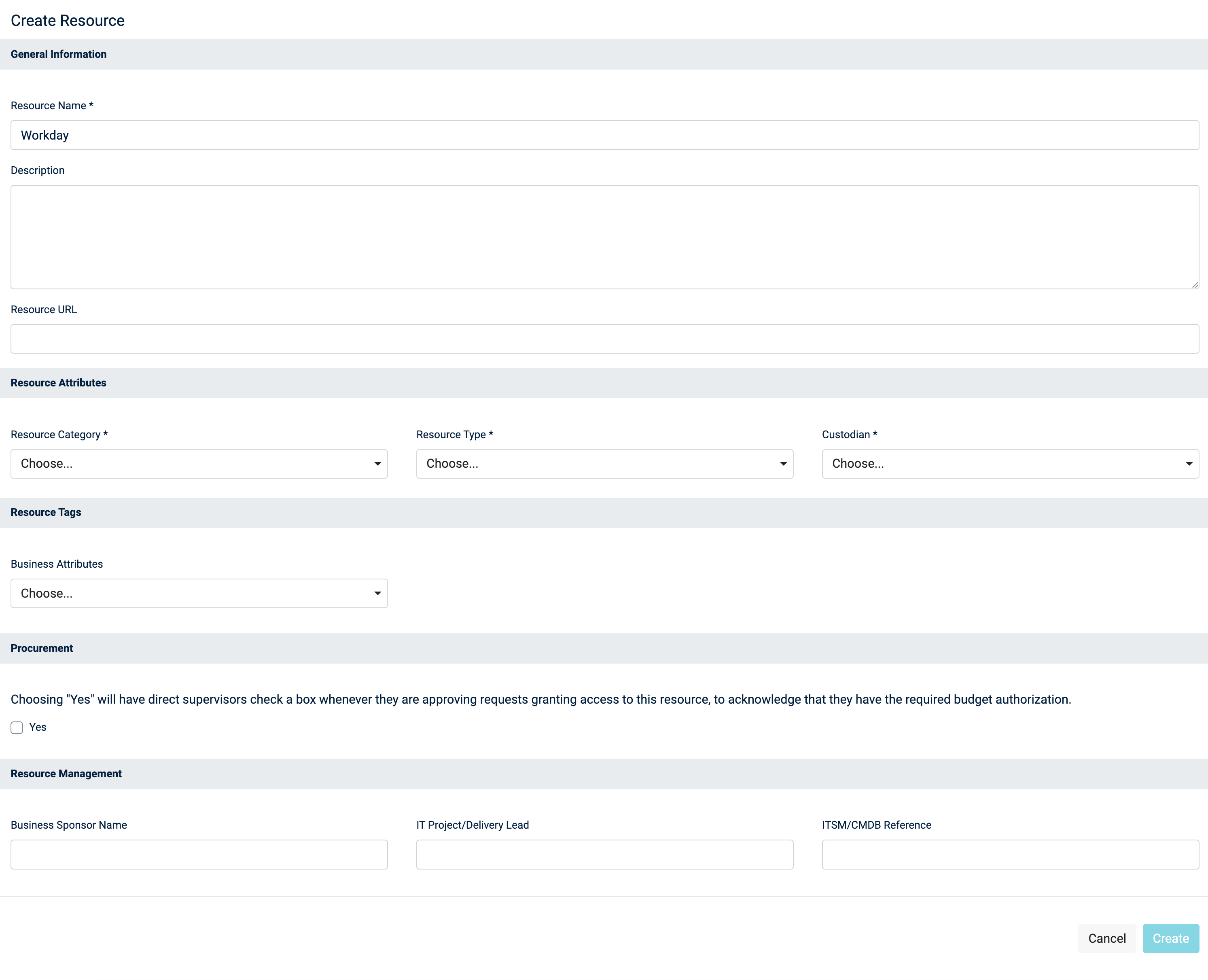 Please note that the resource Category field can change the process of the access request workflow, and that the Procurement section, if enabled, will also add a validation step by the procurement team for access requests of this resource.