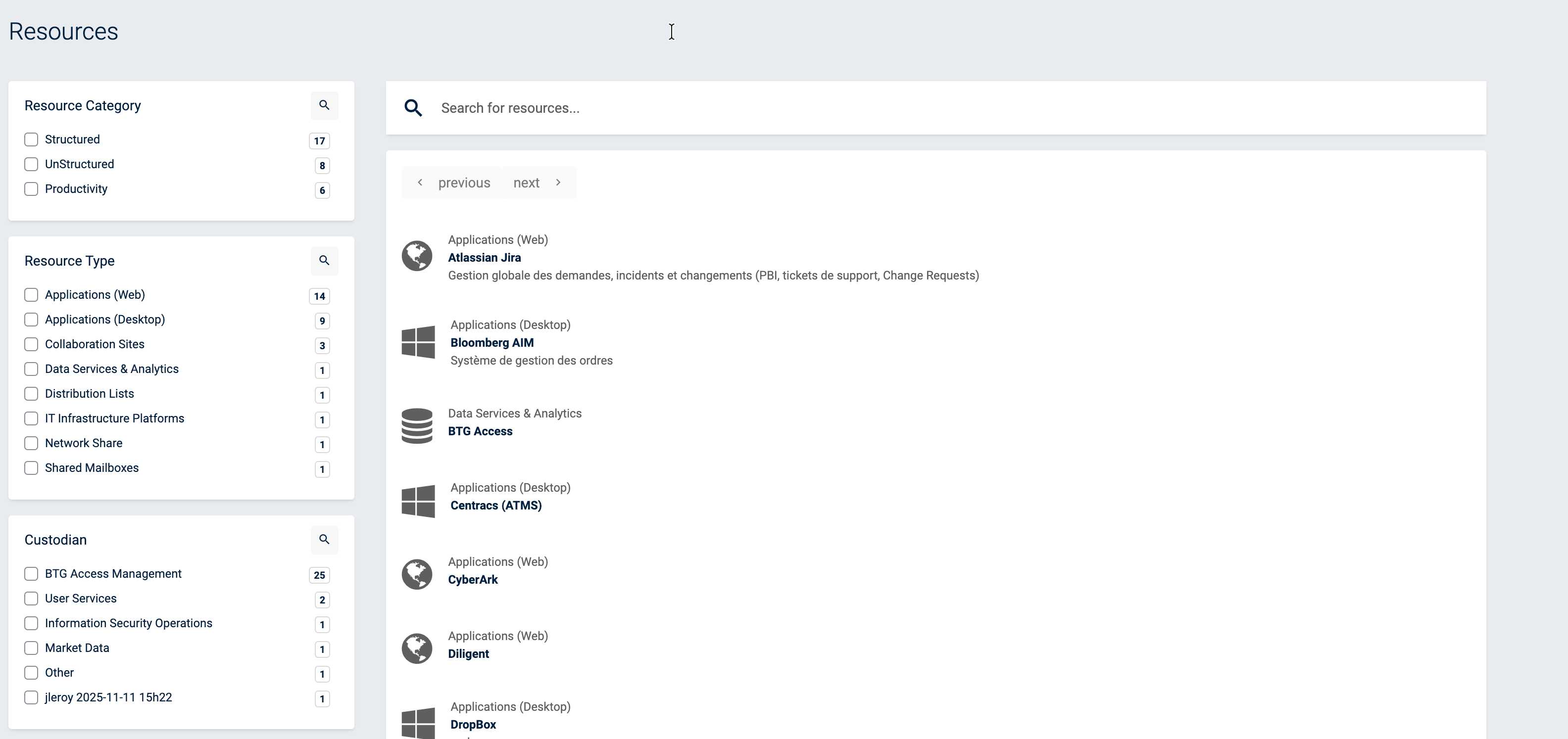 QuartzID allows you to view and manage resources (depending on your role) and the different accesses related to them. In the dedicated module, you can also navigate through resources in order to create an access request.